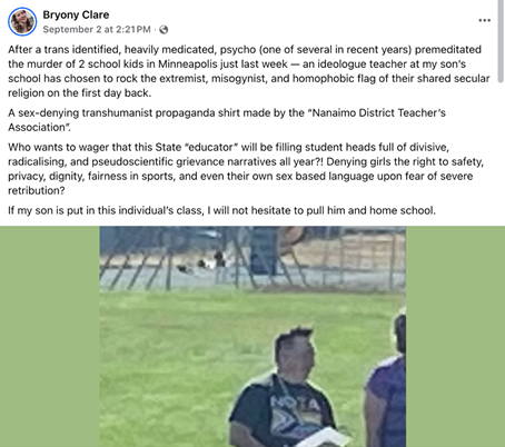 On September 2, Ms. Dixon posted a blurry picture of a staff member at her child’s elementary school wearing a controversial flag on their shirt. She commented that, “an ideologue teacher at my son’s school has chosen to rock the extremist, misogynist, and homophobic flag of their shared secular religion on the first day back.” It is noteworthy that the school board sports the same Pride symbolism in its social media.